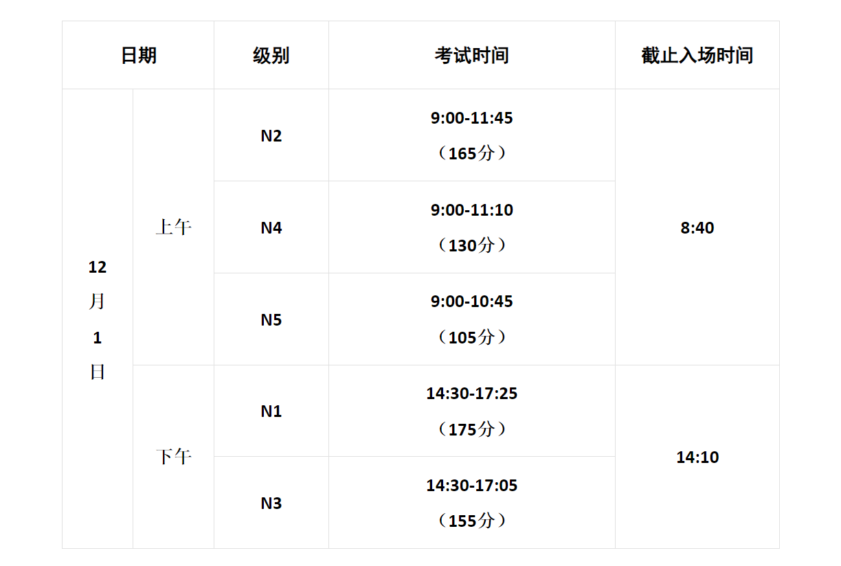 2024年12月JLPT考试时间:12月1日,自本次考试起N2、N4、N5级别在上午进行,N1、N3级别在下午进行,具体时间如上。